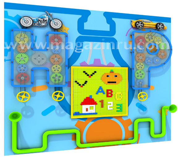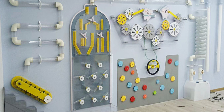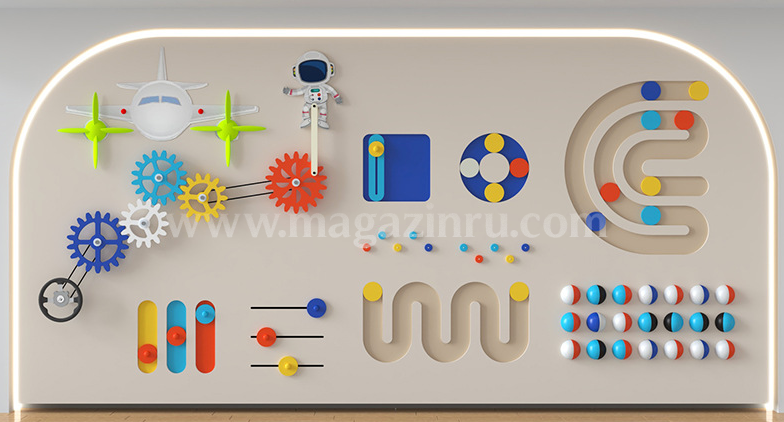 Тактильная и визуальная стена подарит незабываемые впечатления. Вращая сферы, поворотные механизмы, цепные реакции шестерёнок, демонстрирующие науку, лежащую в основе простых механизмов, таких как часы и двигатели, интерактивная игровая панель станет отличным инструментом в школе, в детском саду, в детских игровых пространствах, в кафе или в зонах ожидания (больница, аэропорт, клиника). Стена поможет улучшить моторику, зрительно-моторную координацию, счет, цвет, форму, и навыки рассуждения.