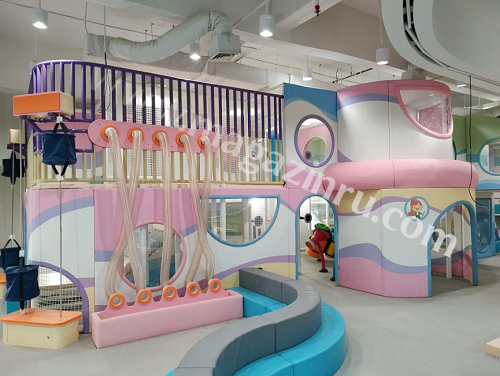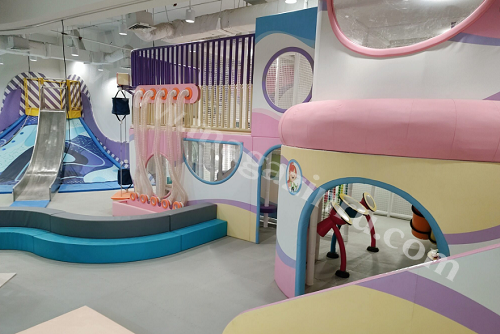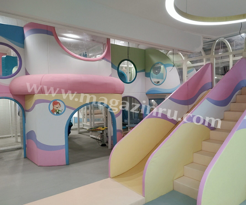 Предлагаем вашему вниманию красочную игровую детскую площадку в развлекательном семейном центре. В игровом пространстве есть множество захватывающих аттракционов для всех возрастов: мягкая игровая площадка для малышей, воздушные пушки с мишенями, батутные полотна, горка-вулкан, интерактивные игровые пневмопанели и другое игровое оборудование. Стиль дизайна яркий и красочный, с игривыми элементами, которые добавляют веселья и азарта в детском игровом центре.