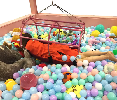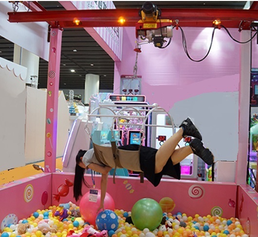 Аттракцион “Хватайка” — это кран (тельфер), которым управляет второй участник. Игрок одевает большие мягкие перчатки и пытается ими ухватить игрушки (или другие призы), потом должен перенести их в корзину. Прикрепленный к крану ребенок (взрослый) опускается в “бассейн” с призами и хватает все, что может, а управляющий краном, передвигает, поднимает и опускает.
