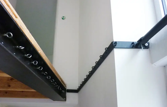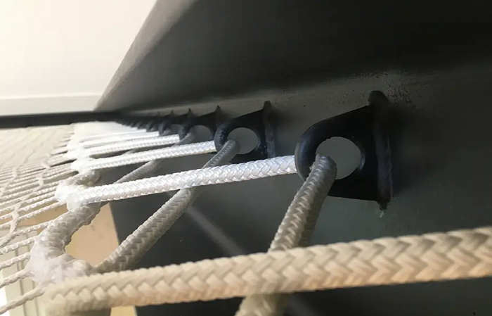 Сетчатое полотно более прочное, чем стандартная сеть. Идеально подходит для использования внутри и на открытом воздухе. Устойчива к любым погодным условиям. Она легко устанавливается и снимается. Сетка крепится к пластине из нержавеющей стали с помощью двойной системы шнуровки, пересекаемой двумя белыми натяжными тросами диаметром 10 мм. Крепкая сетка-гамак может выдерживать нагрузку до 210 кг/м². Следует отметить, что подвесную настенную сеть нельзя использовать в качестве батута.